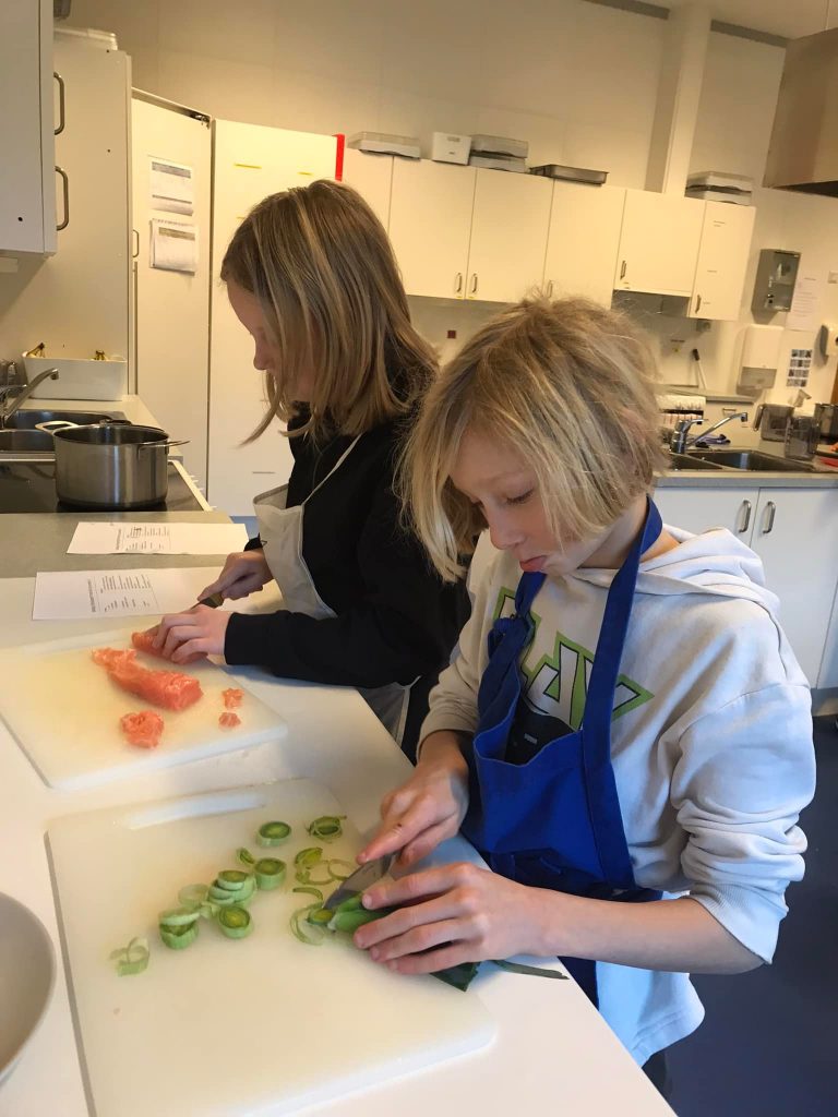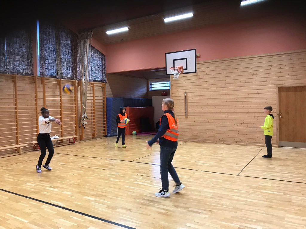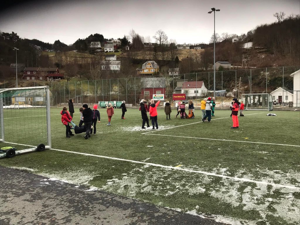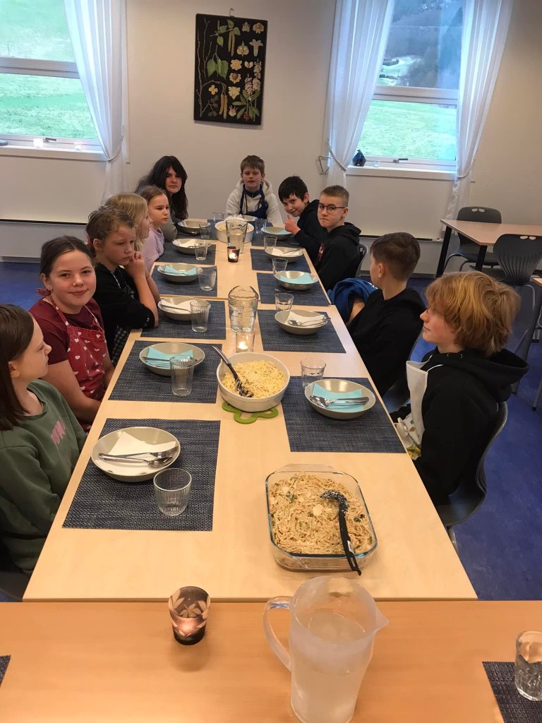 Bilde frå mat og helseøkt der elevane i gruppe 2 har invitert kvarandre på varm lunsj to onsdagar på rad ? Trivselsleiarane organiserte sykehustikken ute og volleyball inne i friminutt ? Kjekt ?