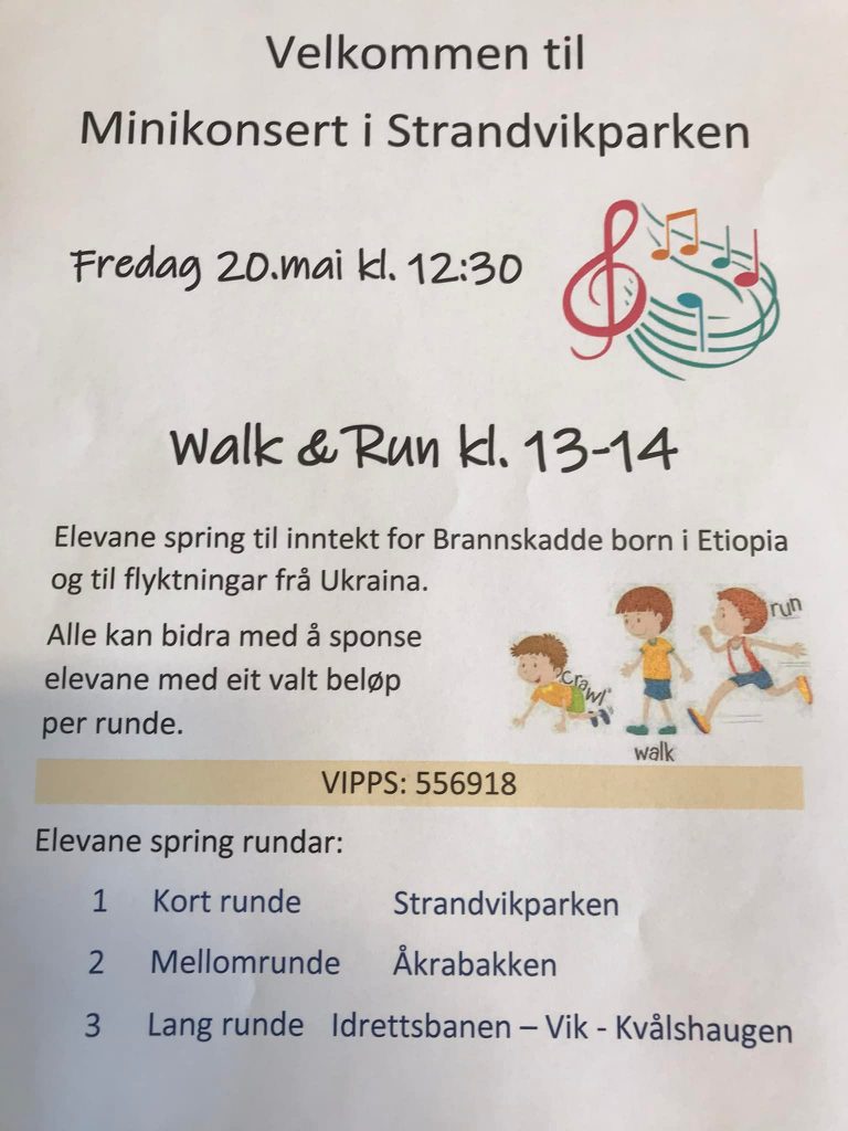 Velkommen til Minikonsert i parken kl 1230, fredag 20.mai Kl 1300 blir det Walk and Run-løp, der elevane spring til inntekt for «Brannskadde born i