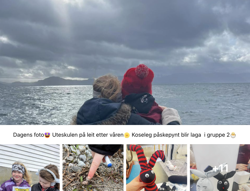 Dagens foto. Uteskulen på leit etter våren. Koseleg påskepynt blir laga i gruppe 2.